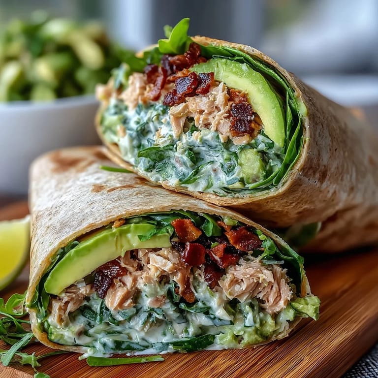 Save to Pinterest Each wrap brings together the natural creaminess of avocado and the savory taste of tuna, balanced with fresh spinach and brightened by a touch of lemon juice. Wrapped in whole wheat tortillas, this meal offers fiber and wholesome grains to keep you energized.